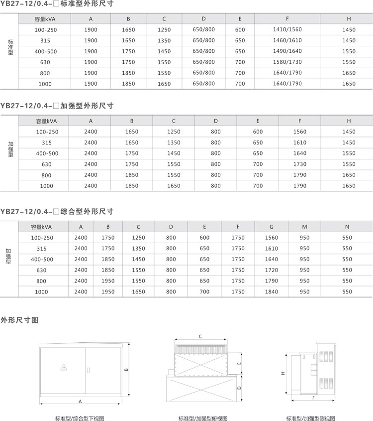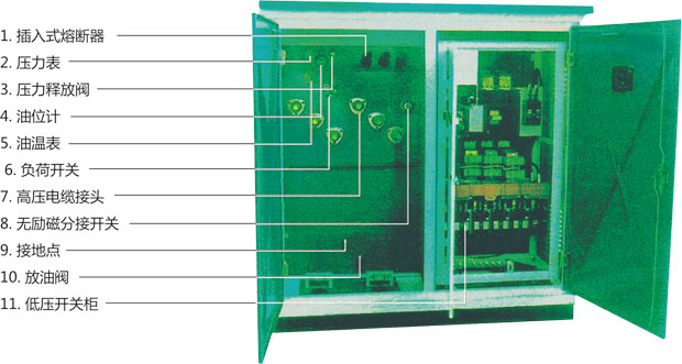 該產(chǎn)品將高壓負(fù)荷開關(guān)、高壓熔斷器置于變壓器油中,具有與變壓器器身共箱或分箱兩種結(jié)構(gòu)形式。油箱采用全密封結(jié)構(gòu),配有油溫表、油位表、壓力表、壓力釋放閥、放油閥等元件以監(jiān)測變壓器運行狀況。該產(chǎn)品分為環(huán)網(wǎng)型、終端型及電源型供電方式。為了使此種產(chǎn)品更適合于我國電網(wǎng)的實際要求,公司又推了插拔型干式熔斷器,熔絲的熔斷不影響變壓器油的性能。根據(jù)低壓饋出要求的復(fù)雜程度,YBM-12/0.4型產(chǎn)品分為標(biāo)準(zhǔn)型、加強型和綜合型三種外殼形式,使用戶和設(shè)計單位在選型時,做到更靈活、更經(jīng)濟。