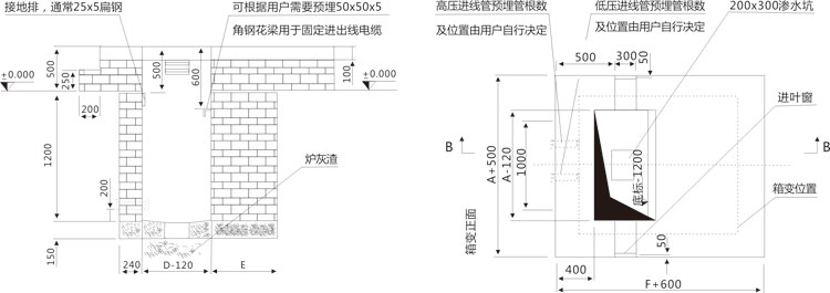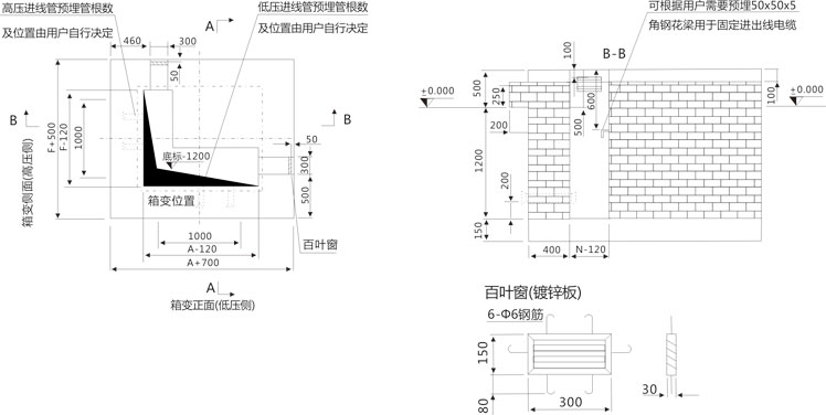 ◎ 為進(jìn)線方便用戶可根據(jù)現(xiàn)場實際情況在三個或四個方向設(shè)置電纜井。