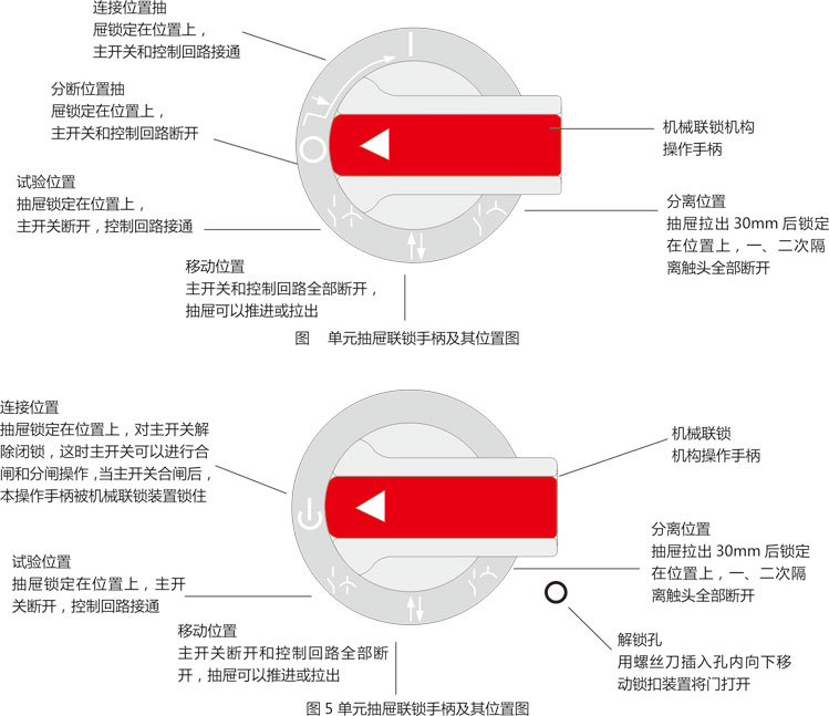 ◎ 抽屜單元有可靠的機械聯(lián)鎖位置。通過操作手柄控制,具有明顯準(zhǔn)確的合閘、試驗、抽出和隔離位置。操作機構(gòu)功能見圖4、圖5。