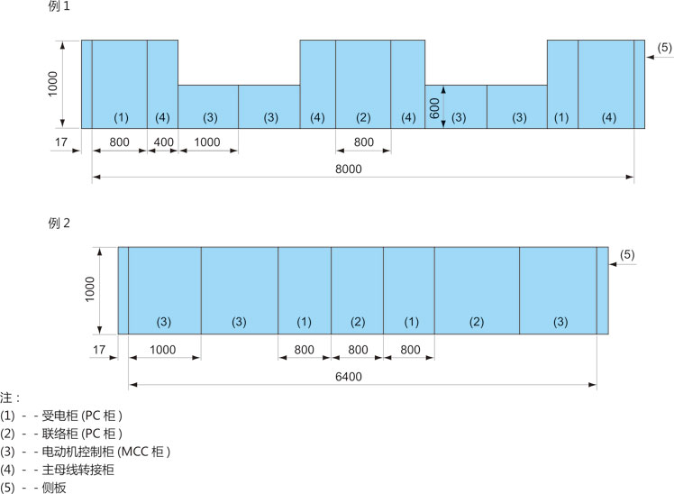 ◎ 當(dāng)PC與MCC二種裝置相鄰排列時,則:1.當(dāng)MCC雙面柜(或600深度的MCC單面柜)與PC柜相鄰排列時,在二柜之間必須加轉(zhuǎn)接柜(其寬度為400mm)如圖6例1所示。2.將單面操作的MCC加深到1000mm時,則可以不加轉(zhuǎn)接柜,如圖6例2所示。